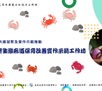 經濟部水利署第六河川局延續「鹽水溪流域整體改善與調適規劃」特色河段環境營造構想,將推動公私協力合力完成特色河段導覽解說牌實作示範,以針對選定之鹽水溪觀海橋下游河段執行,透過實作示範工作坊,以河川走讀、盤點資源、參與式設計及實作等方式,希冀能凝聚各方共識,完成2面導覽解說牌。
